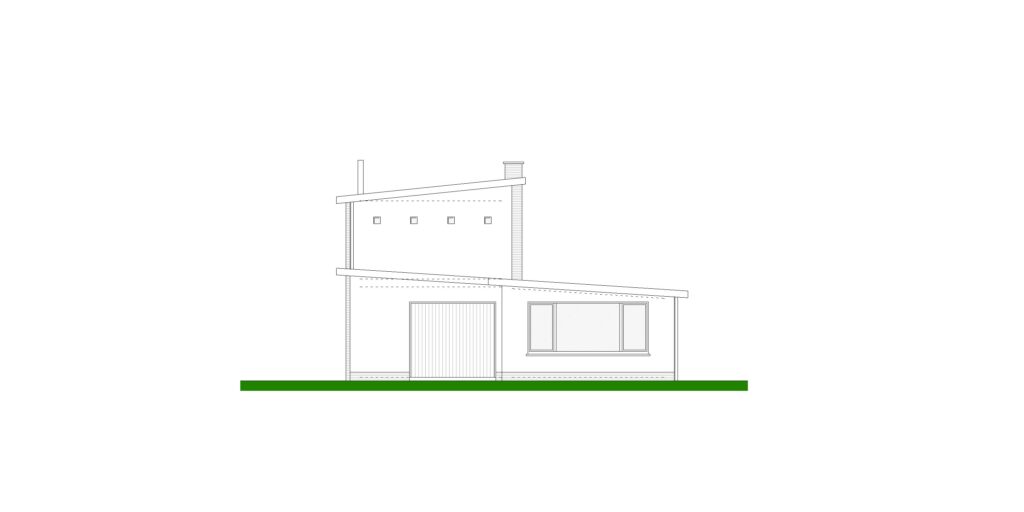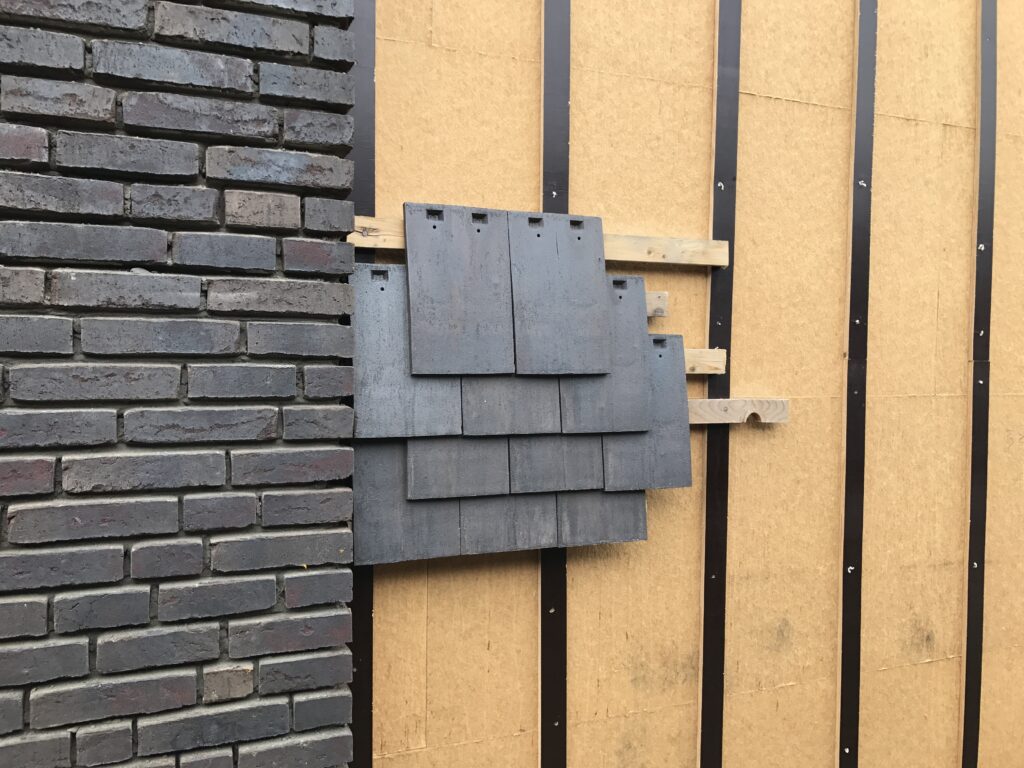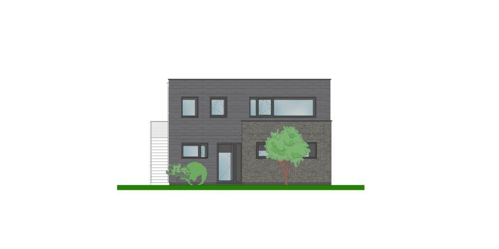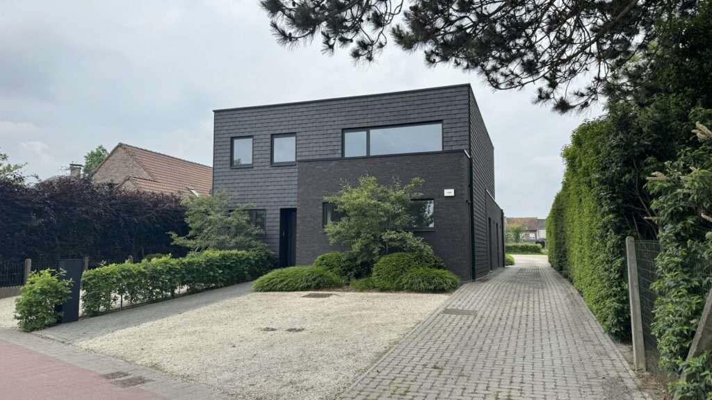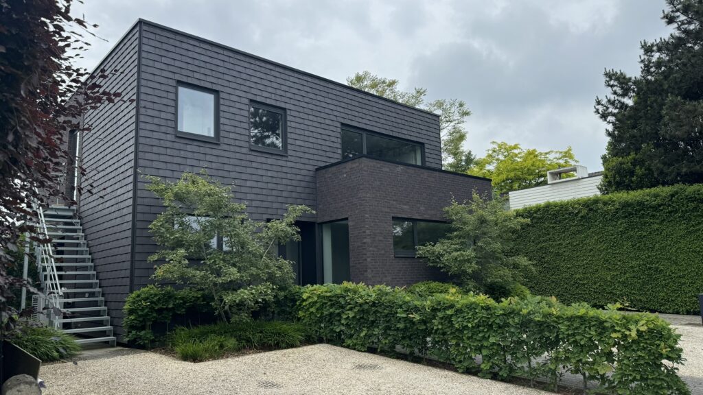 De gevel is een strakke combinatie van volumes in baksteen en vlakke gevelpannen, in combinatie met zwart schrijnwerk.