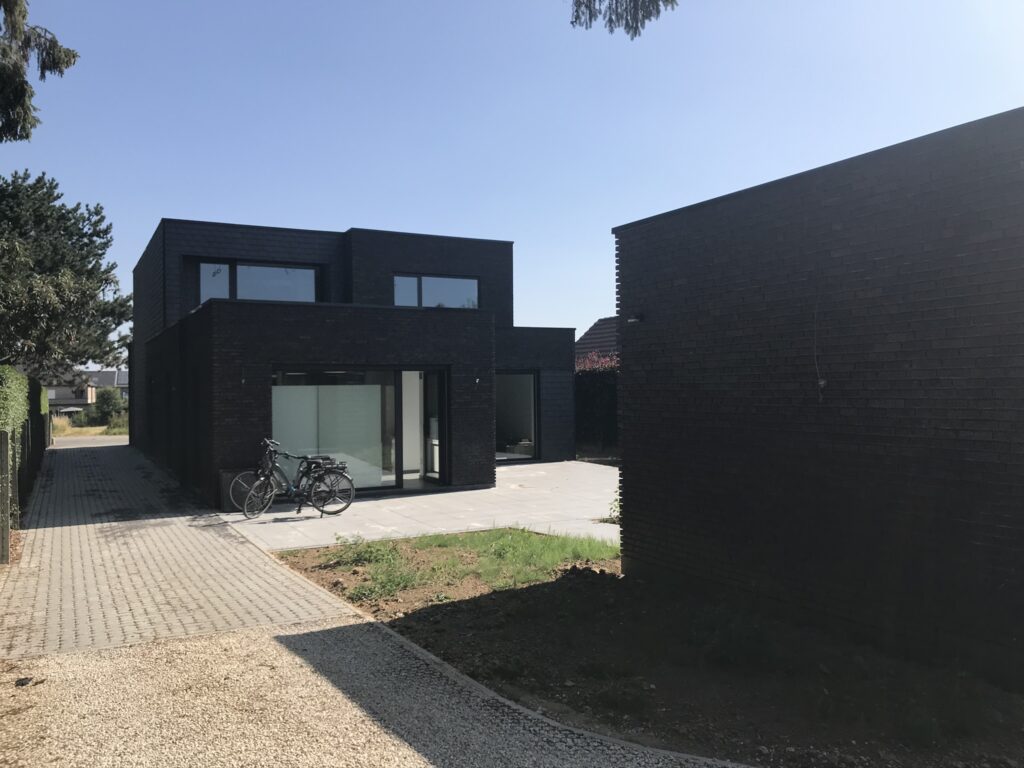 Materialen: Gevel in baksteen en vlakke dakpan, ramen in zwart aluminium