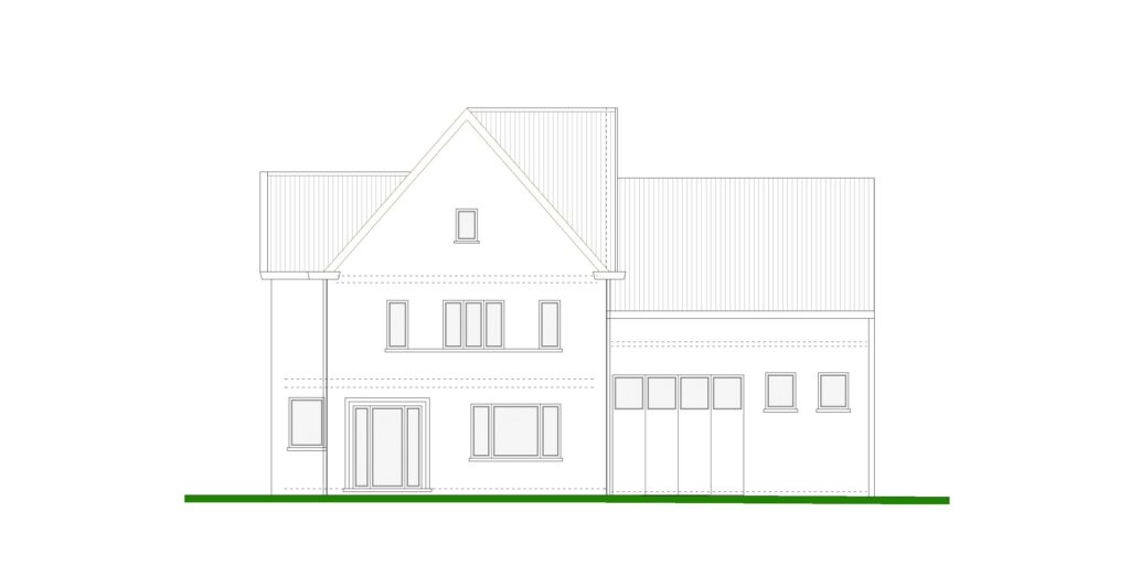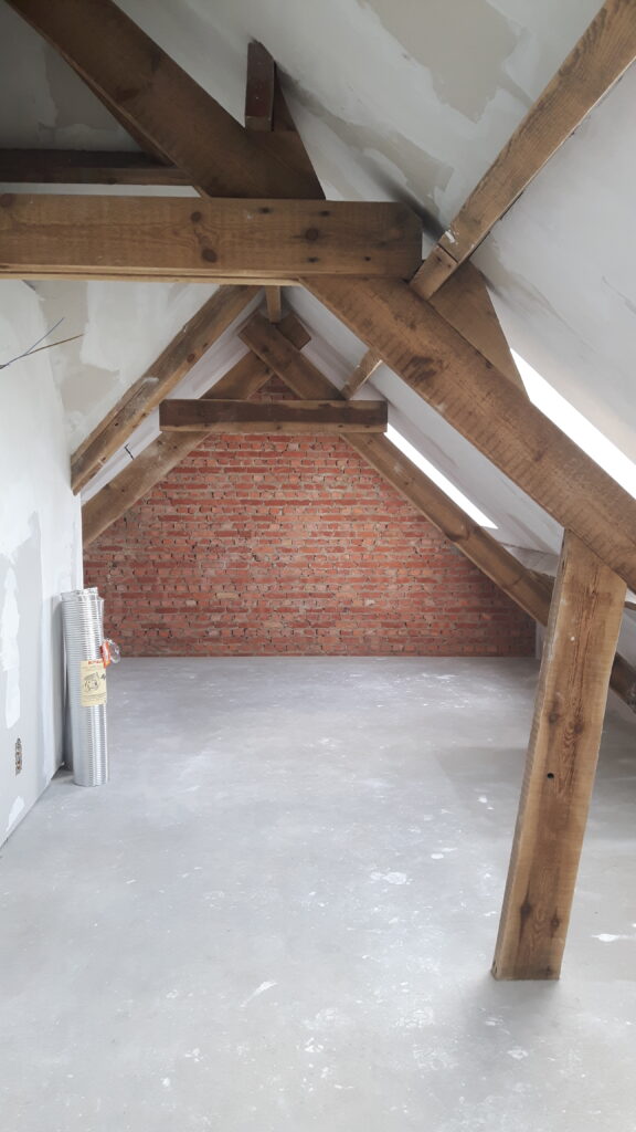 De vroegere garage/loods rechts werd omgevormd tot ruime leefkeuken met mezzanine naar de slaapkamers.