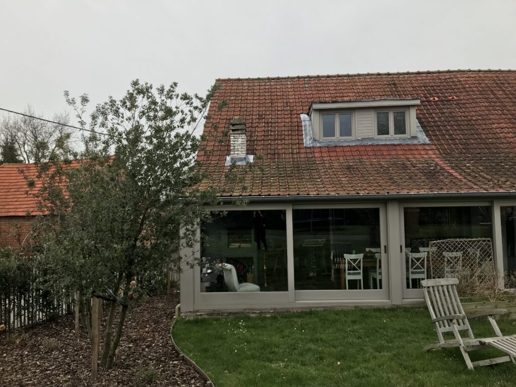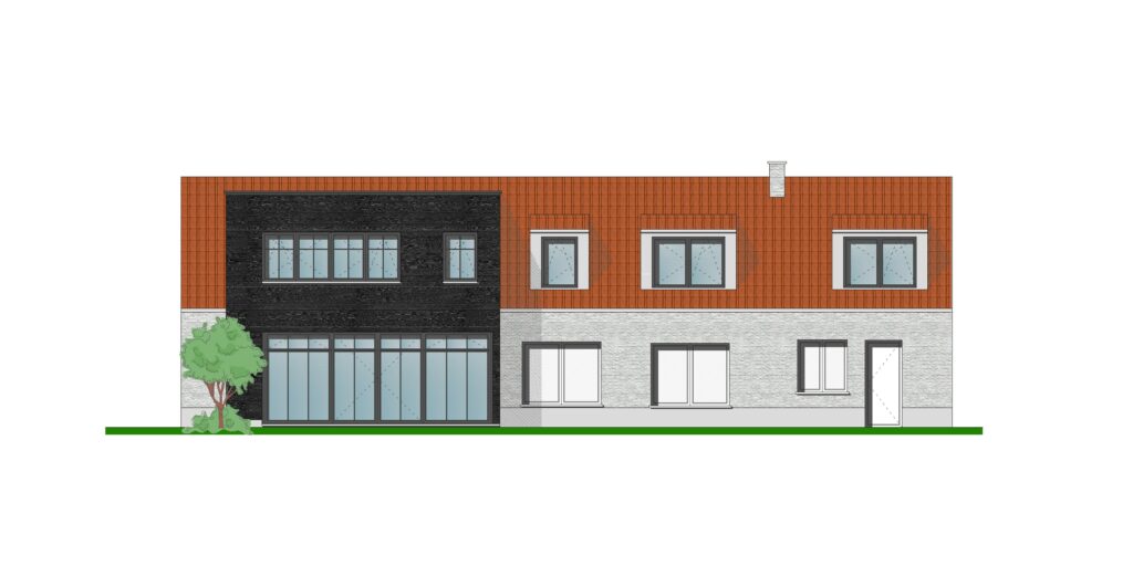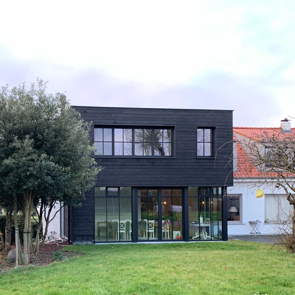 Er werd gekozen voor een uitbreiding in Shou Sugi Ban, dewelke een sterk contrast geeft met de rode dakpannen en witgeschilderde gevel van de bestaande woning. De grote ramen zorgen voor een licht interieur en groot contact met de tuin.