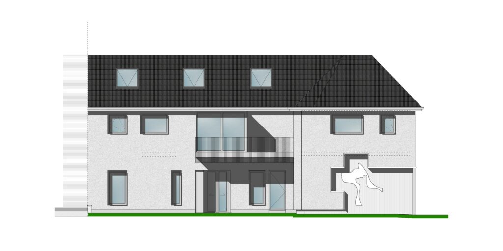 Materialen: Gevel in sierpleister, ramen in wit aluminium, dak in zwarte dakpannen