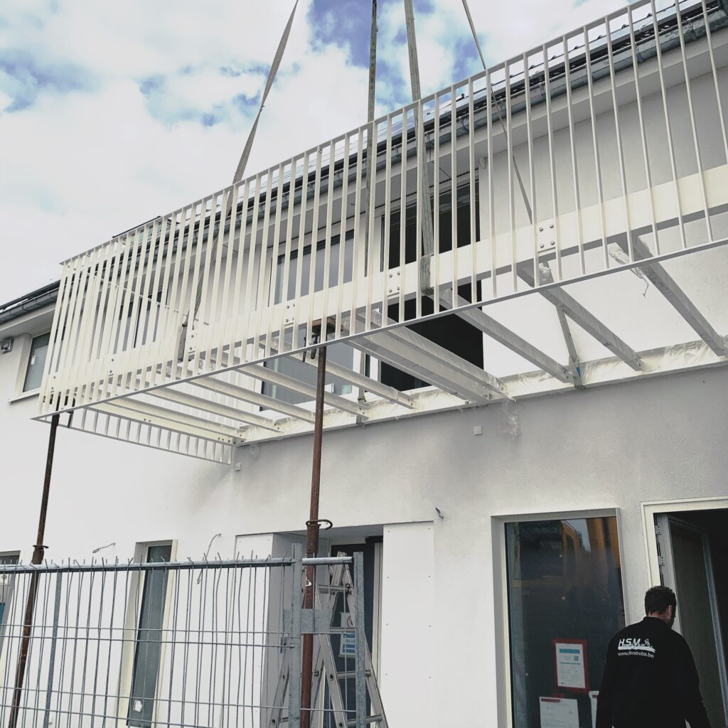 De gevel werd strak opgevat in witte sierpleister met witte aluminium ramen en plaatwerk. De balkons zijn vooraan opgehangen aan de gevel, zodat deze tevens een afdak boven de inkom praktijk vormt.