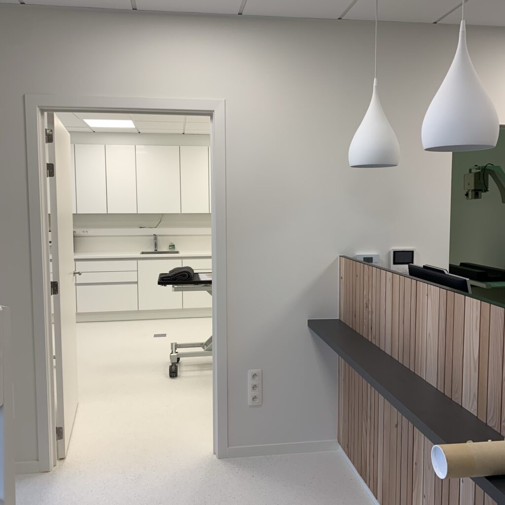 Een gevelaccent rechts met logo in witgelakt staal zorgt voor een niet zo subtiele knipoog naar de dierenartsenpraktijk.