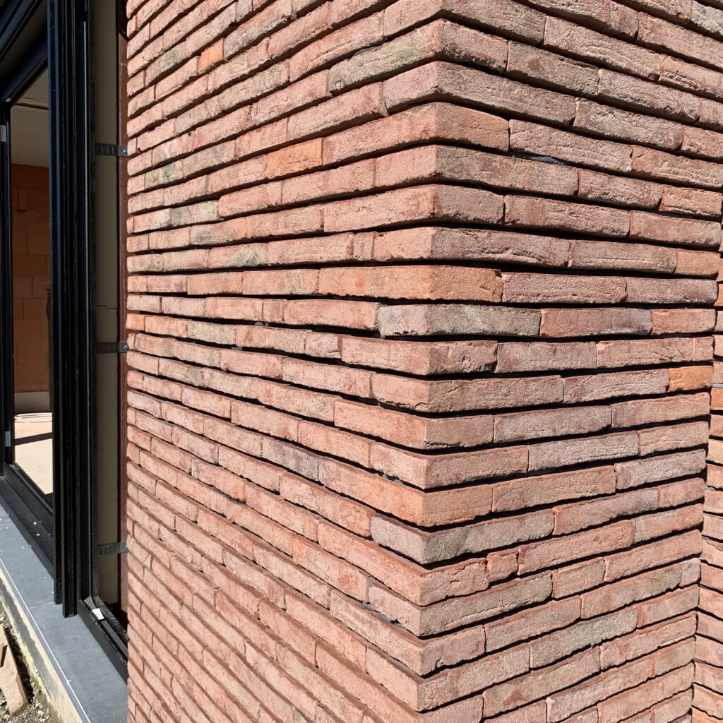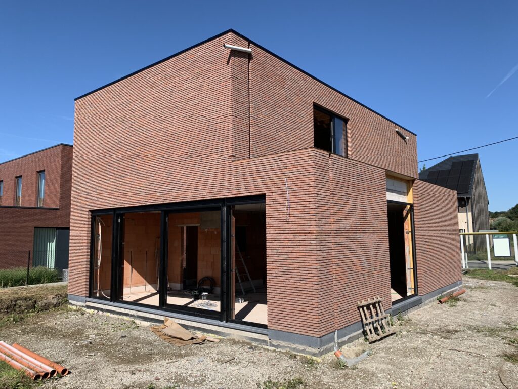 Strakke nieuwbouwwoning in rode gevelsteen in dunmetselwerk, gecombineerd met zwarte aluminium gevelbekleding.