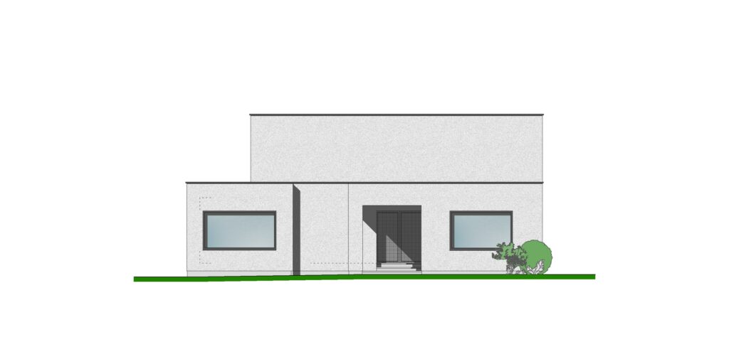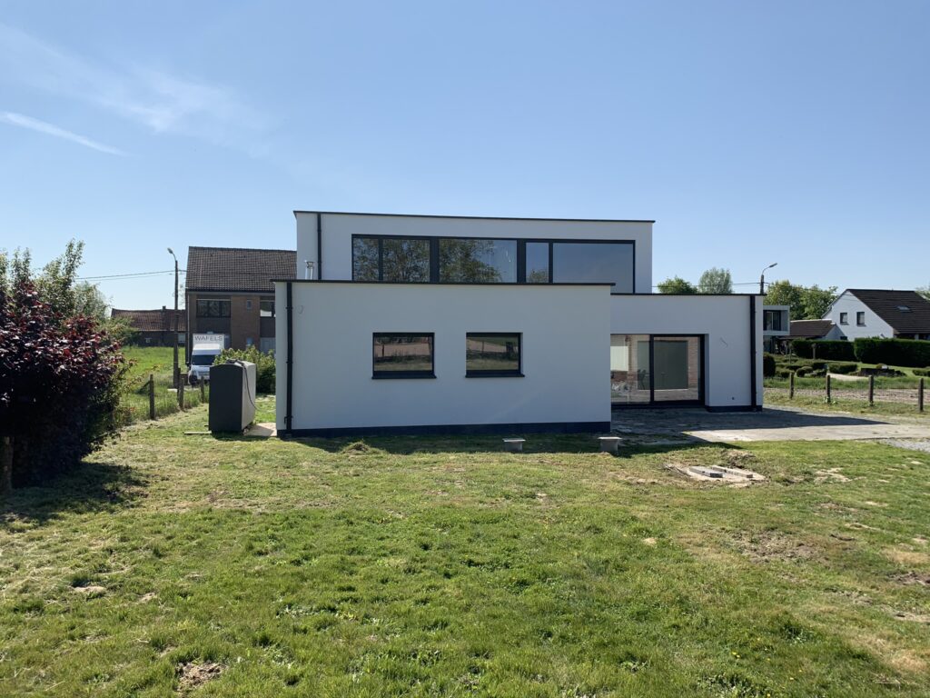 Materialen: Gevel in witte sierpleister, ramen in zwart aluminium