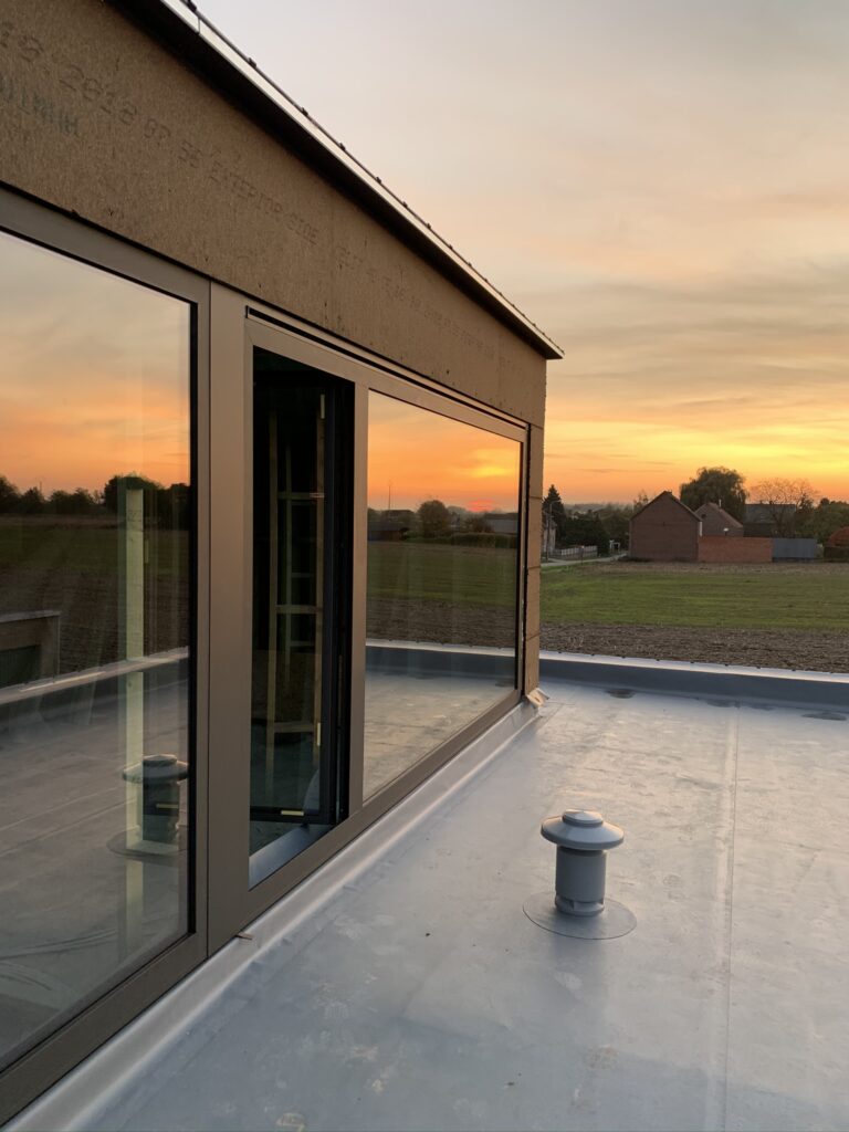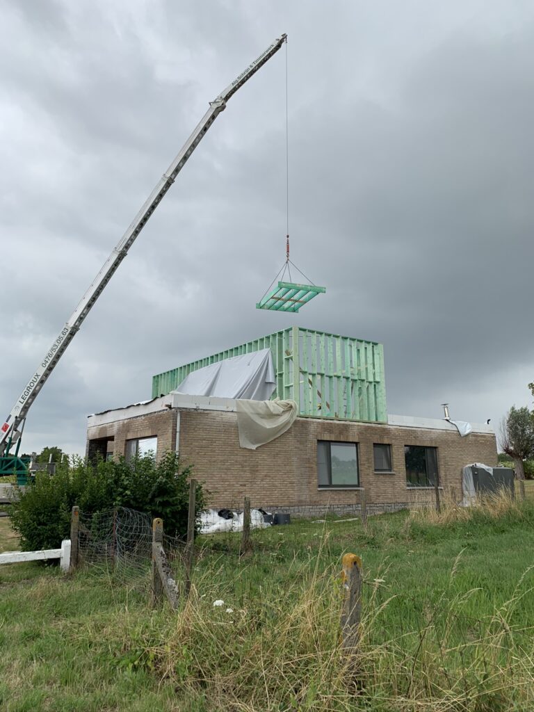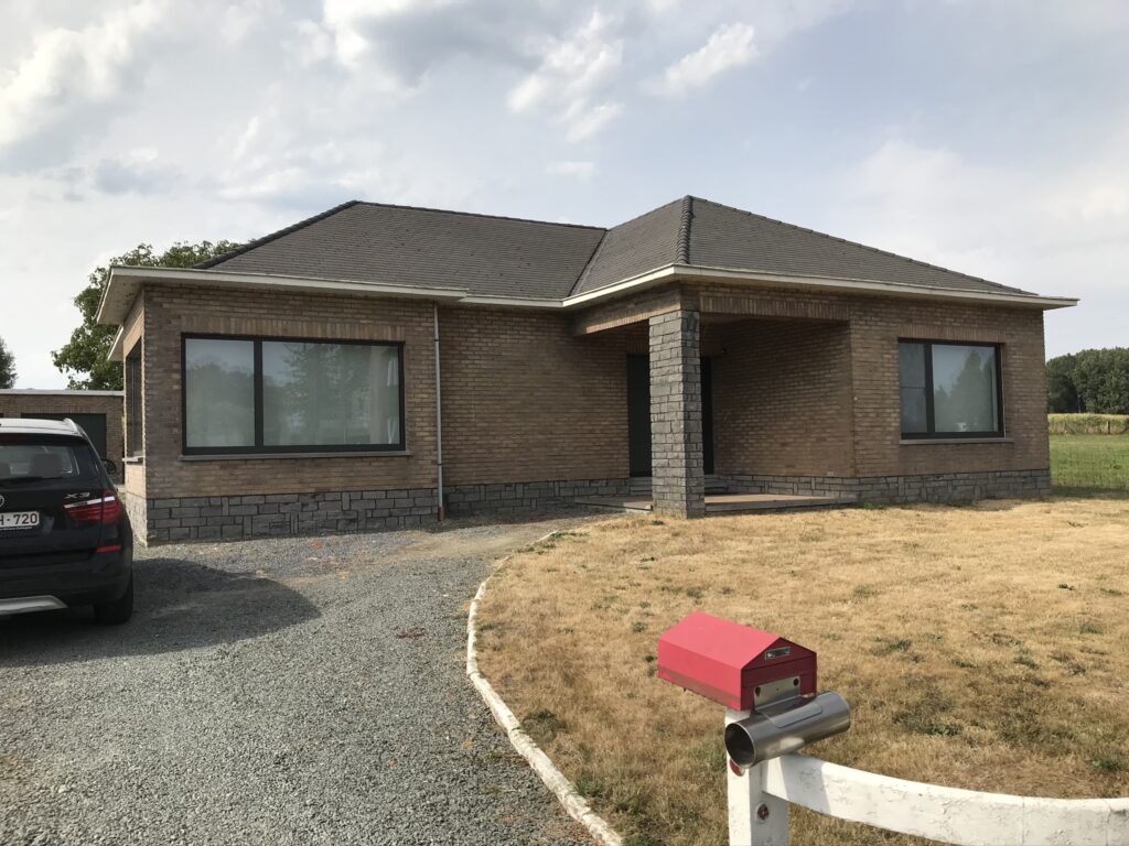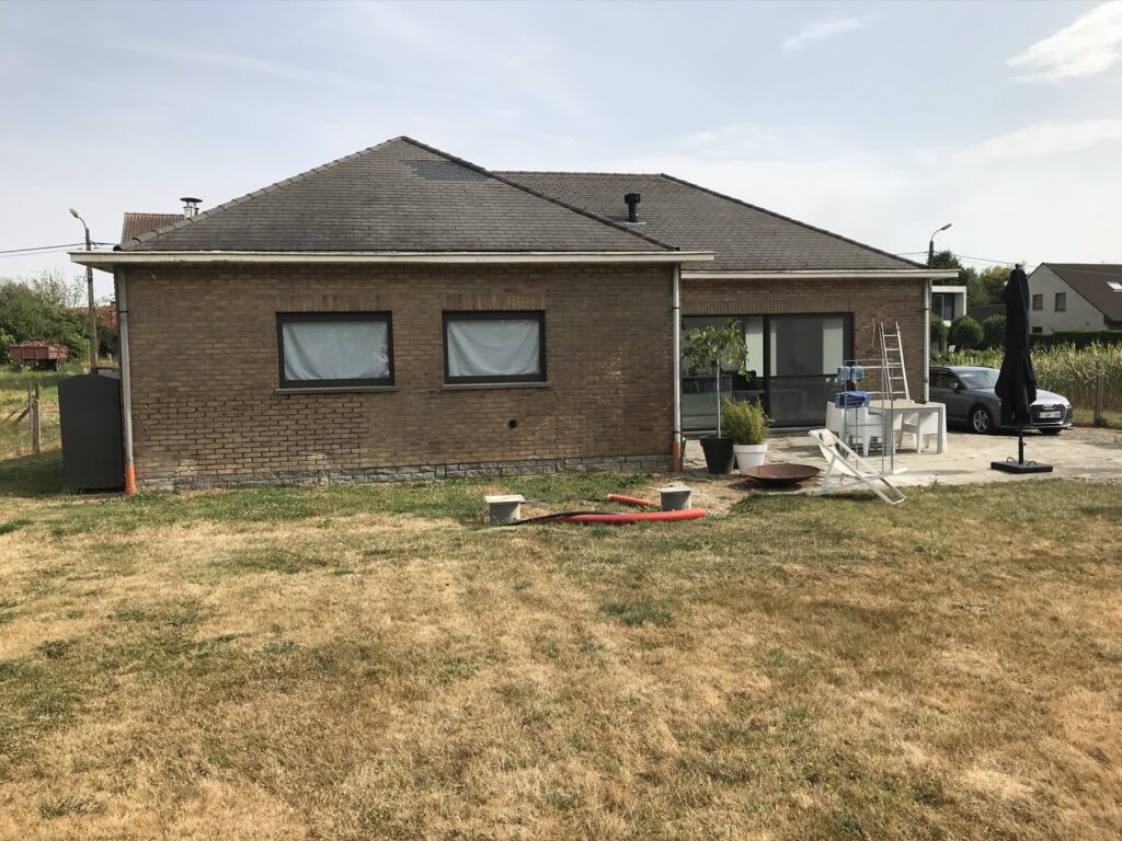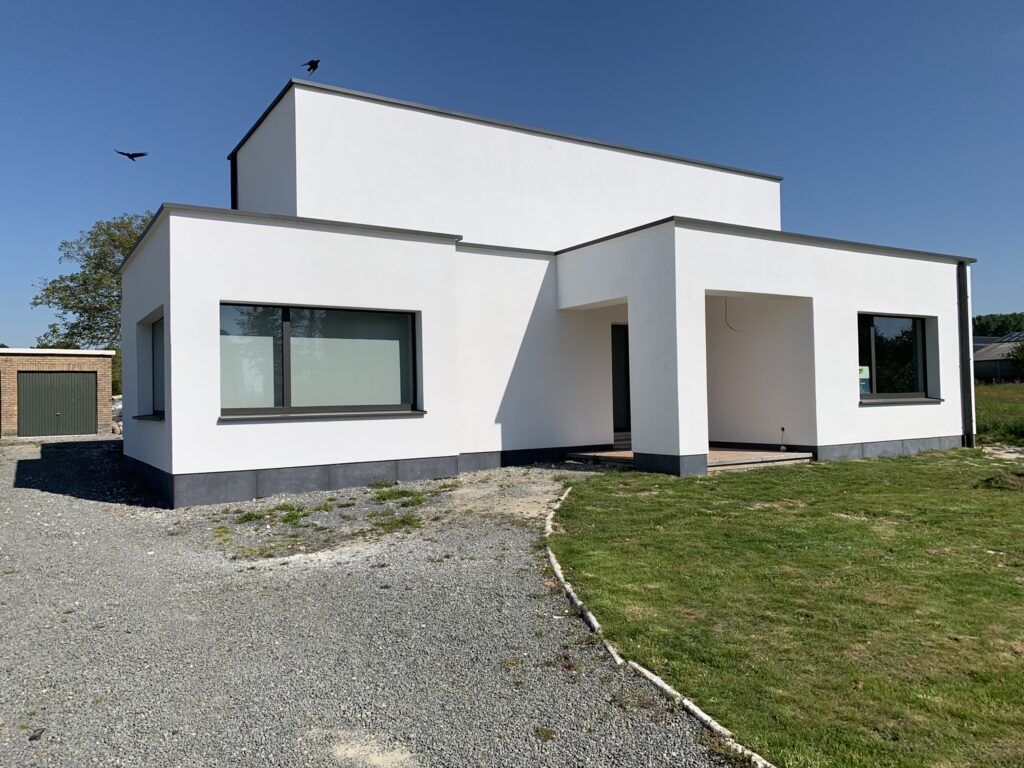Deze eengezinswoning onderging een totaaltransformatie: het hellend dak werd vervangen door een verdieping in houtskelet met plat dak, de bakgoot werd gewijzigd naar een strakke dakrand en de gevel werd afgewerkt met gevelpleister op isolatie.