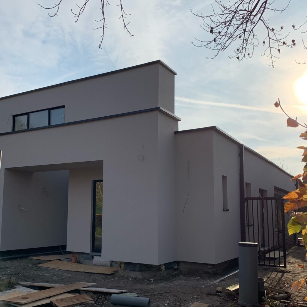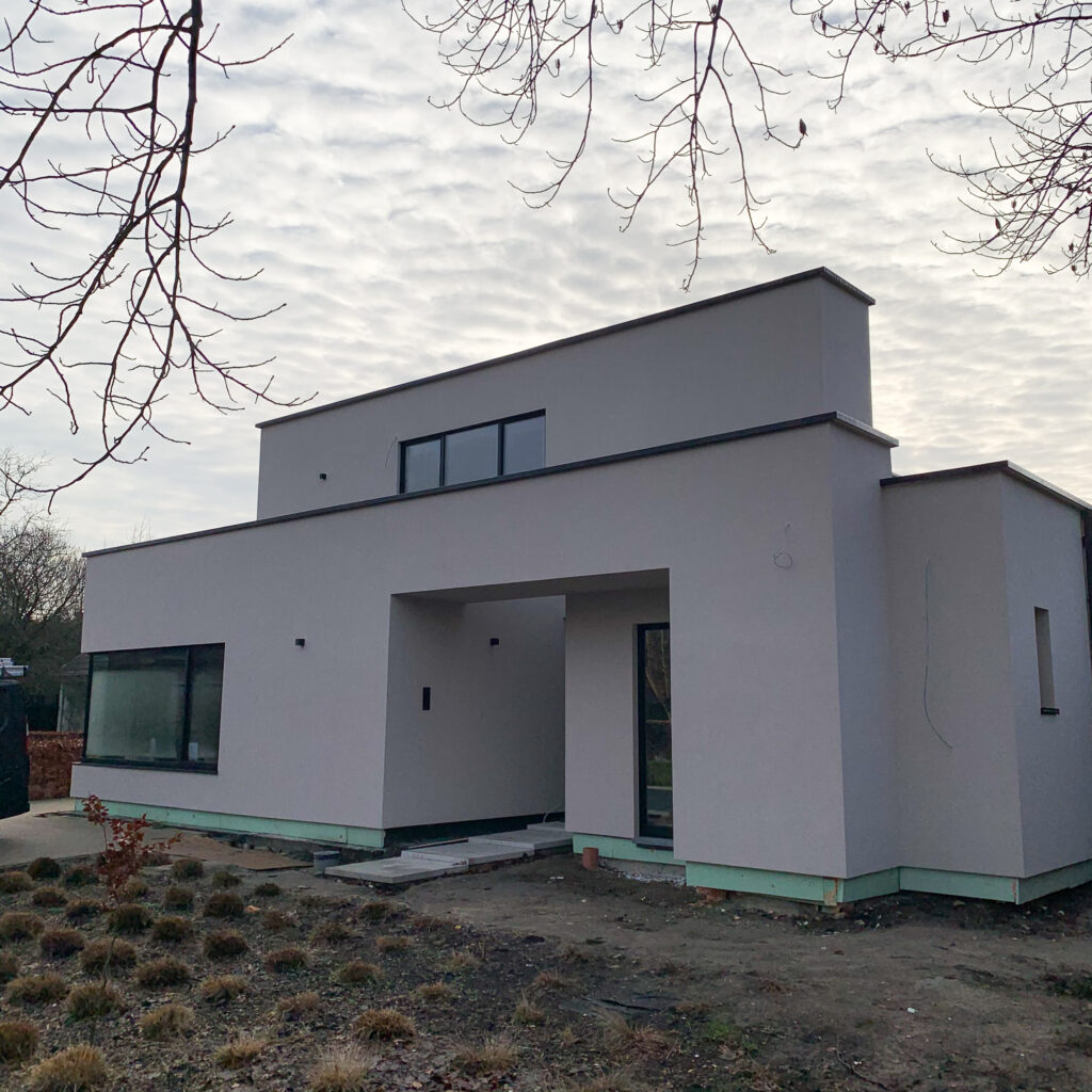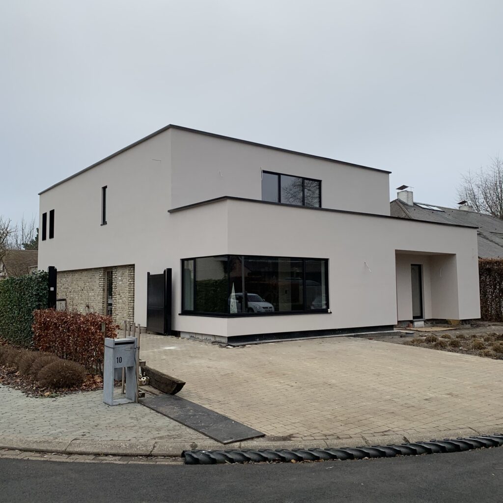 exterieur | gevel in zandkleurig sierpleister, ramen in RAL8022- bruinzwart aluminium, accent in bestaande gevelsteen