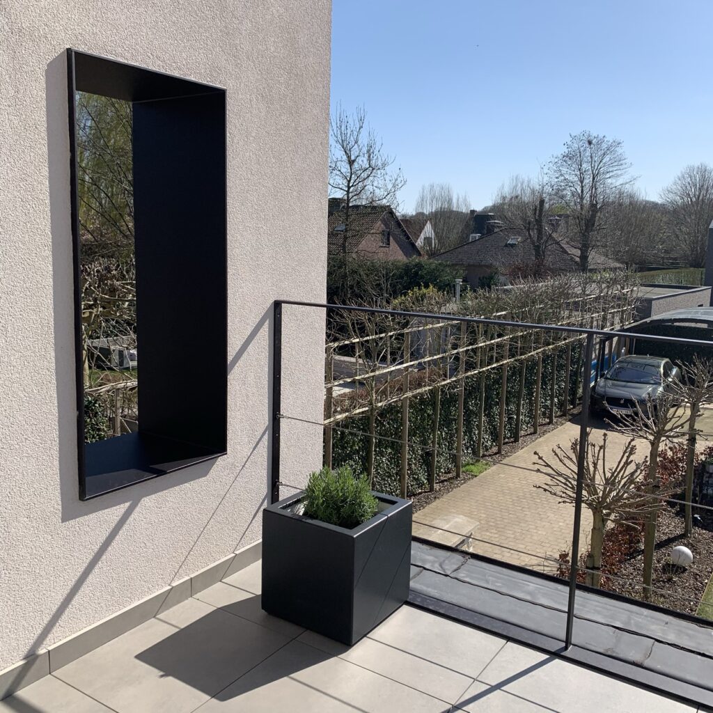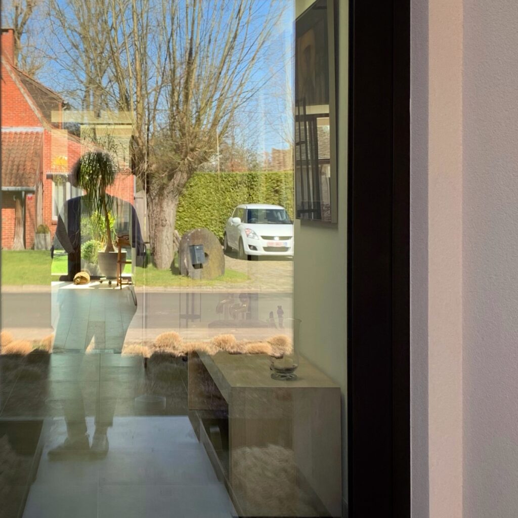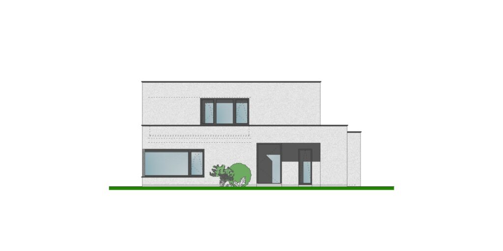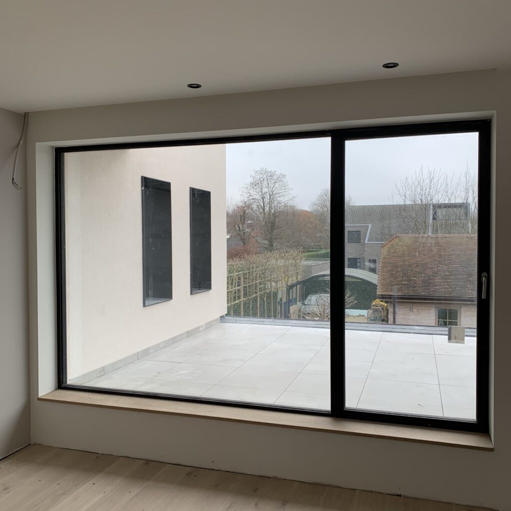 exterieur | gevel in zandkleurig sierpleister, ramen in RAL8022- bruinzwart aluminium, accent in bestaande gevelsteen