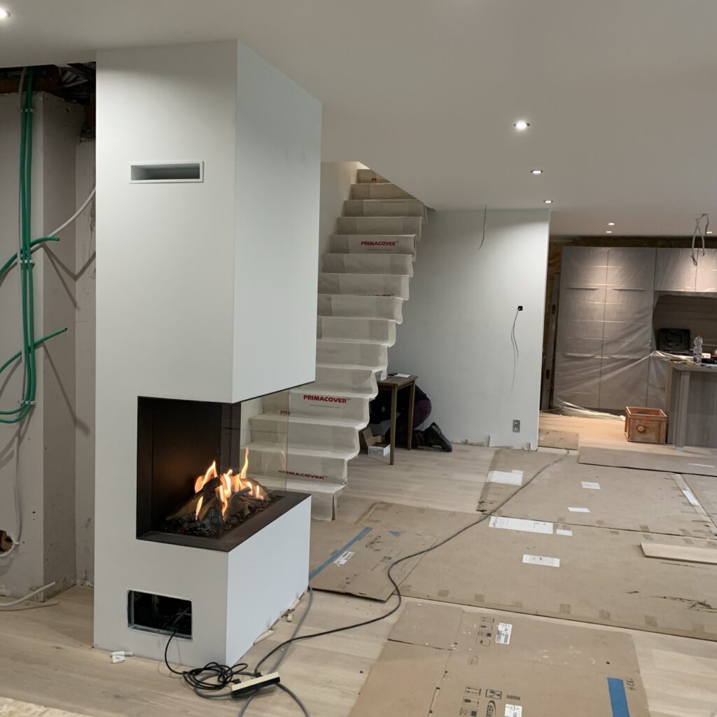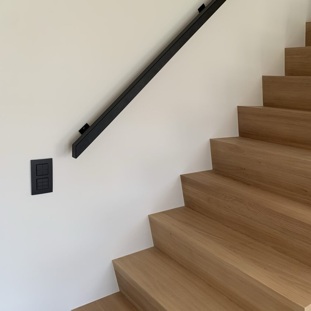interieur | vloer in licht eik in combinatie met zwarte accenten: trapleuning, haard, schakelaars en kranen