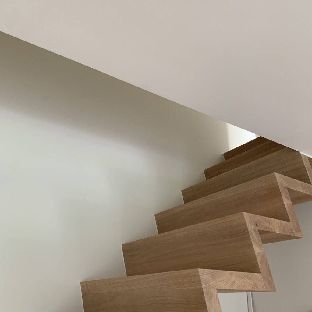 Het interieur kreeg tevens een volledige make-over van nieuwe vloer in licht hout tot strakke zwarte accenten. Een nieuwe Z-trap in hout verbindt nu de slaapverdieping met het gelijkvloers. De centrale open haard zorgt voor warmte waar zowel de keuken als de zithoek van kunnen genieten.