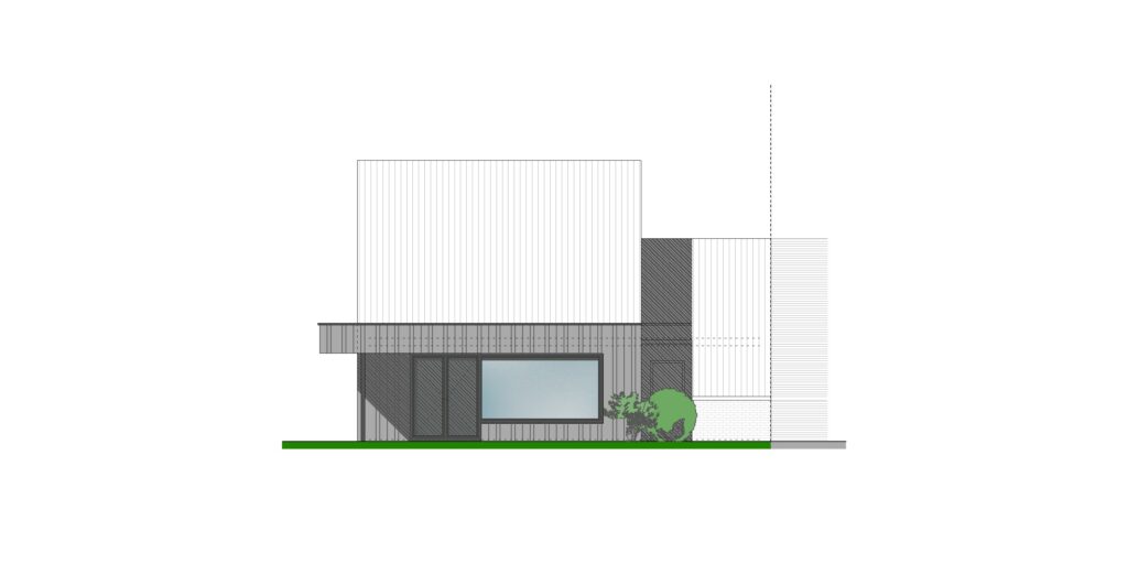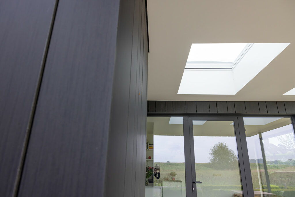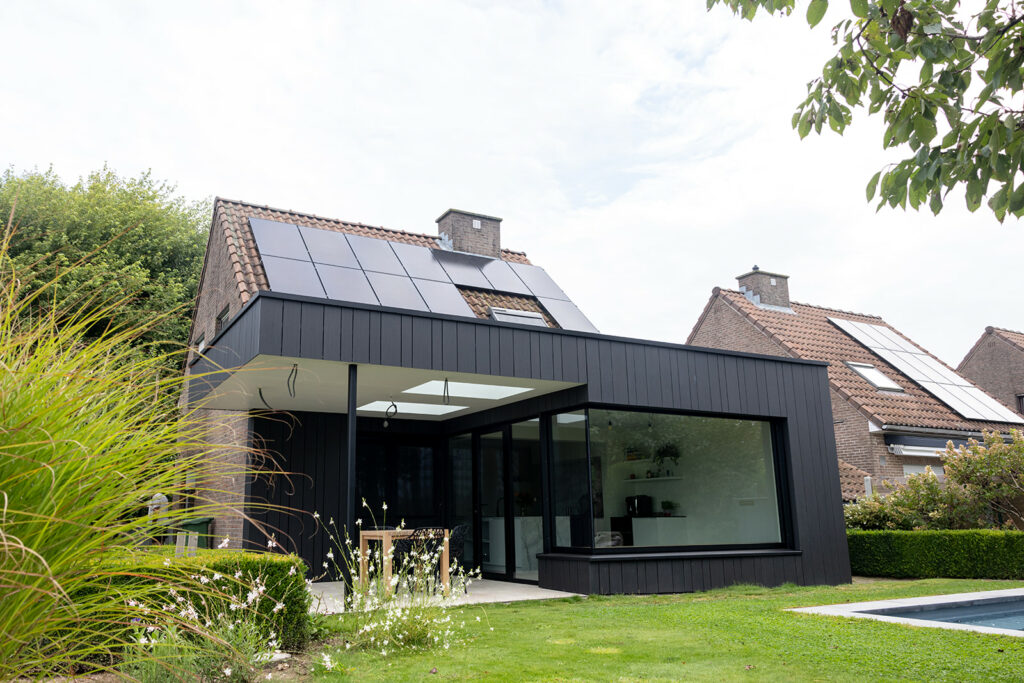 De aanbouw werd strak opgevat met een gevelbekleding in zwarte Trespa, grote raampartijen in glas op glas uitvoering en een overdekt terras met lichtkoepels. Via deze lichtkoepels en de grote raampartijen stroomt zonlicht volop binnen in de leefruimte.