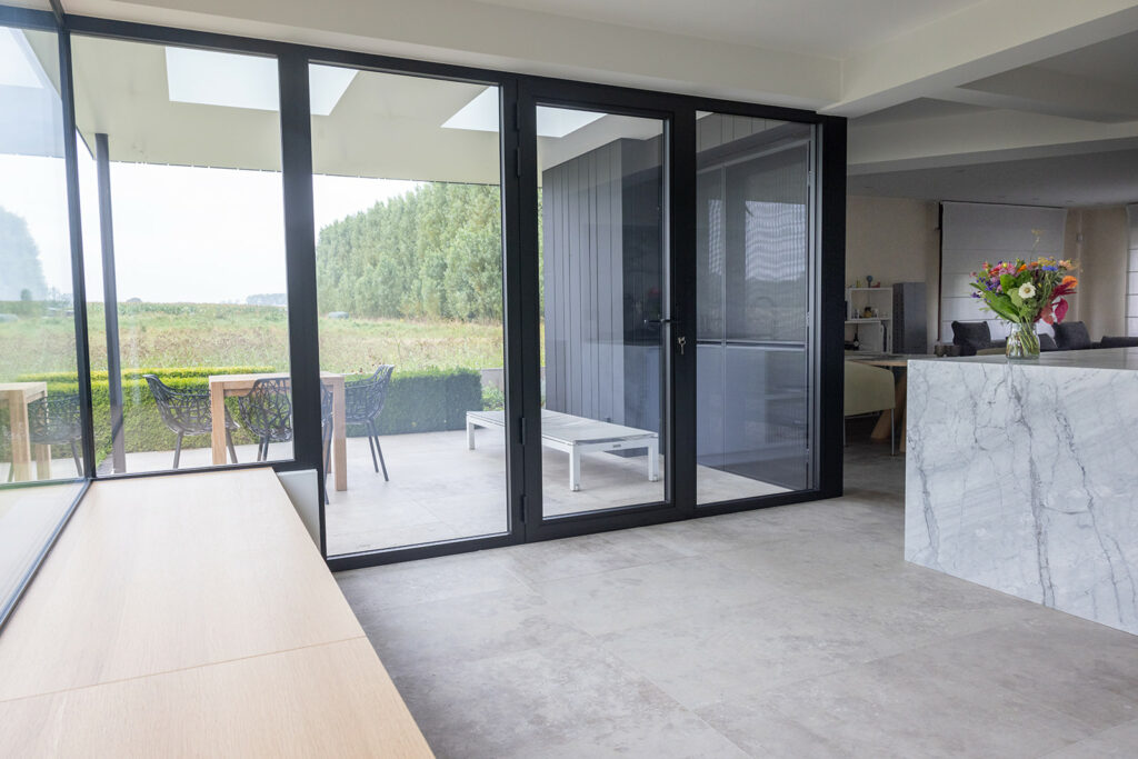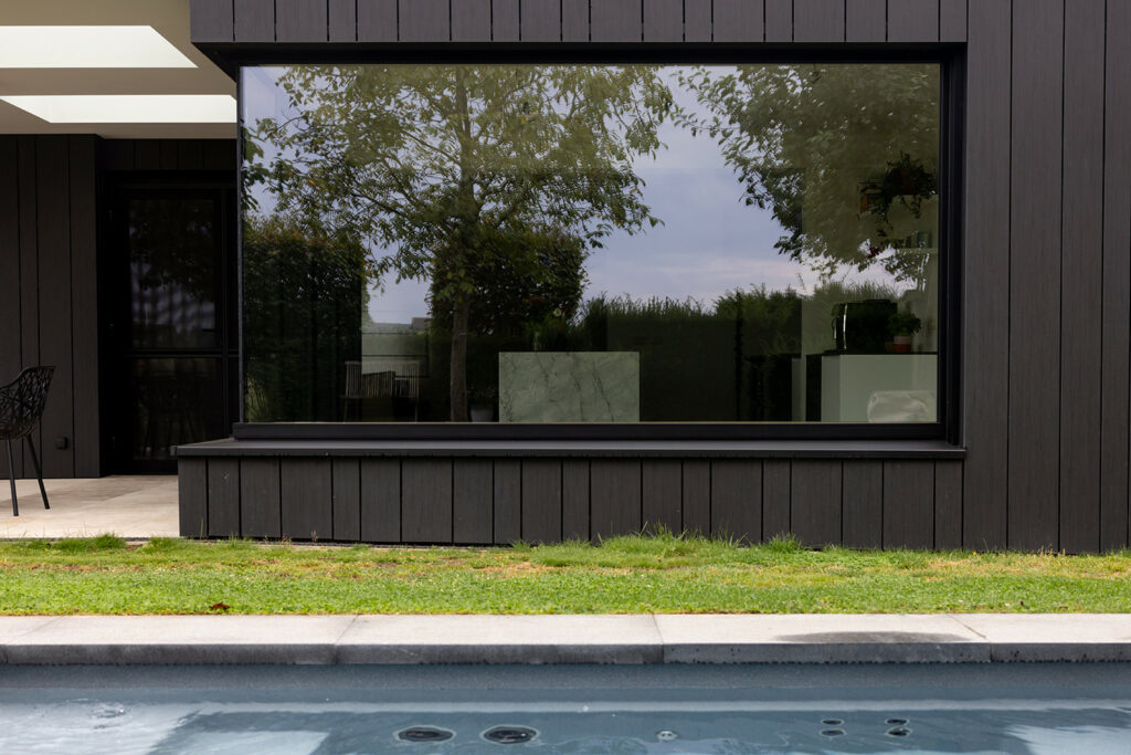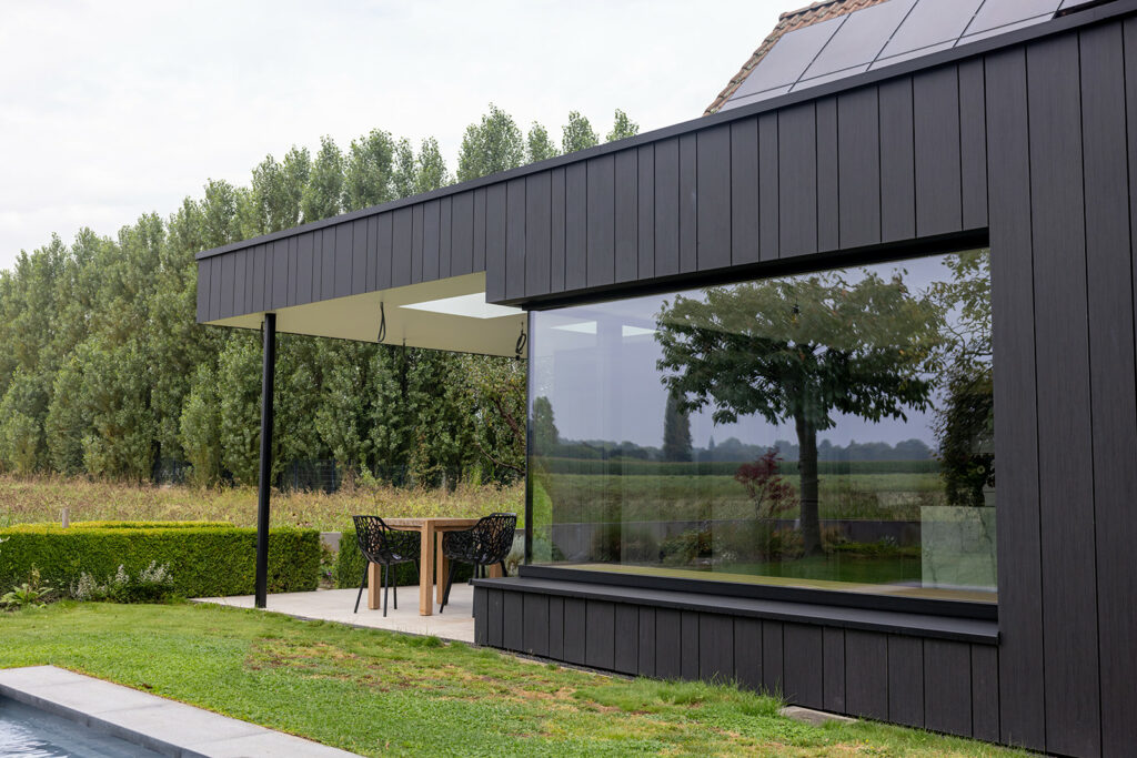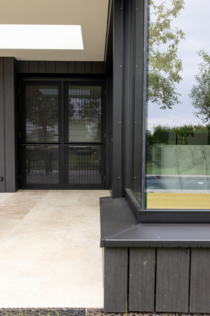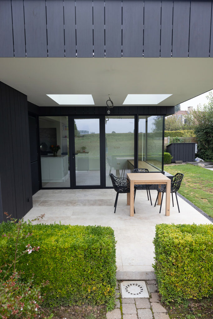 Materialen: Aanbouw in zwarte Trespa, buitenschrijnwerk in zwart aluminium, vloer in tavertijn, accenten in hout en wint marmer