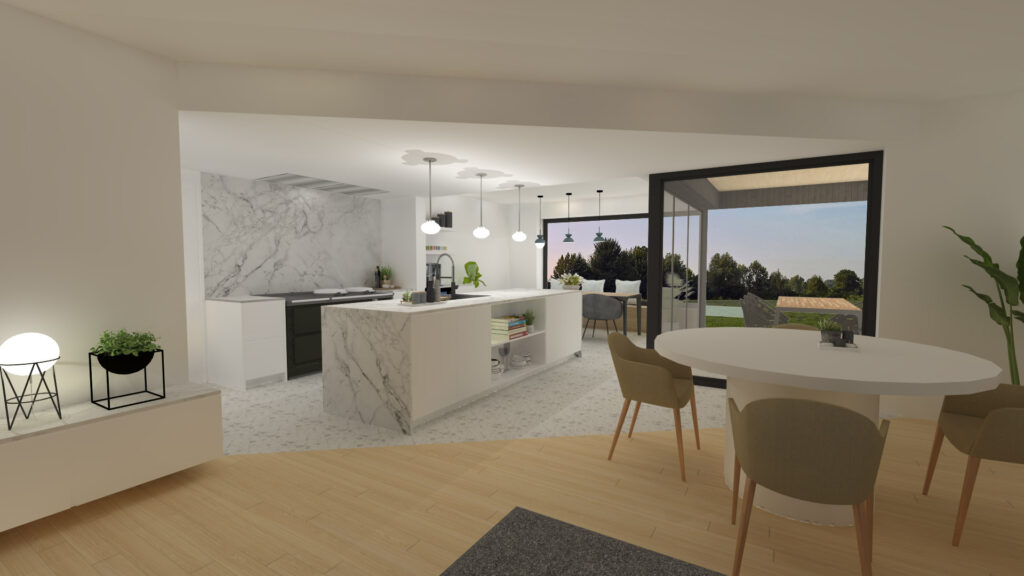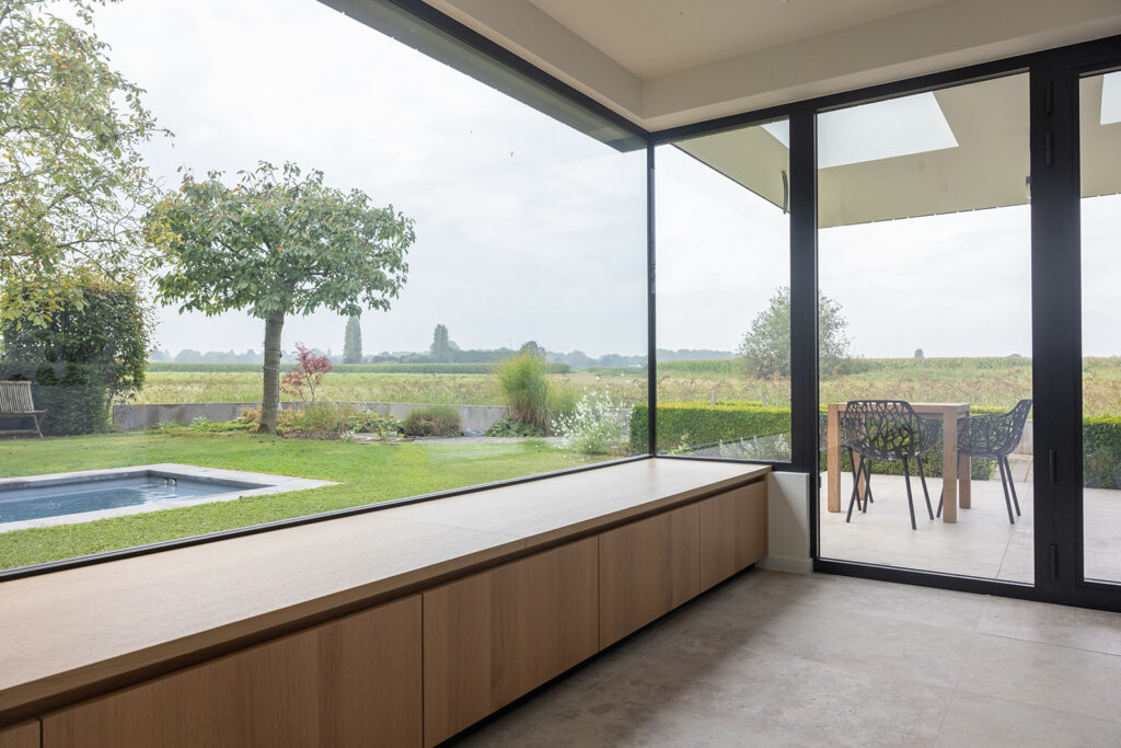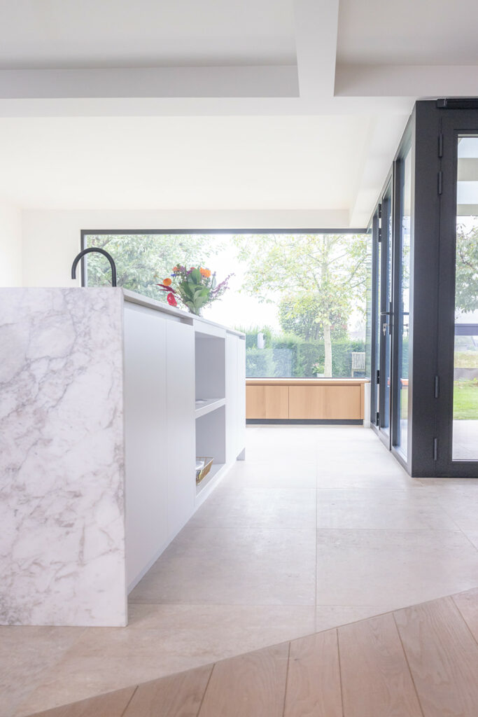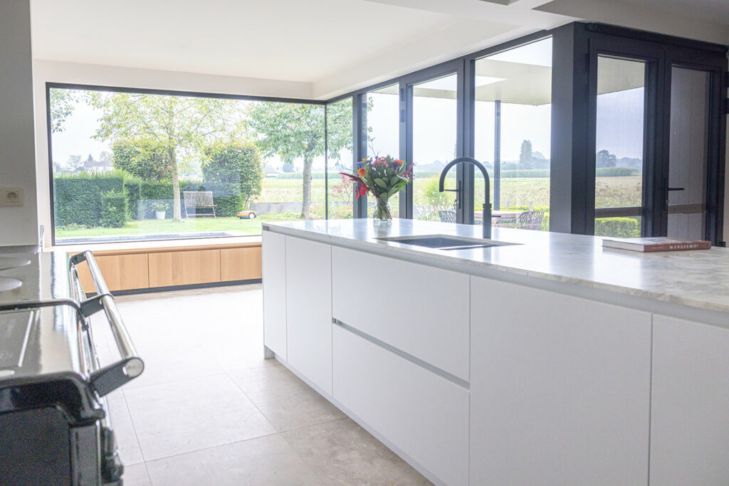 De bouwheer wenste een grotere en lichtrijke keuken die verbinding heeft met zowel de tuin als leefruimte.