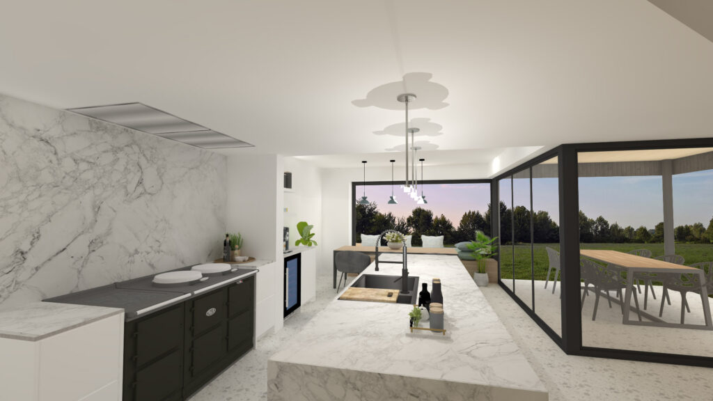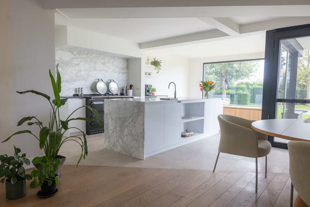 De keuken werd uitgevoerd in zwart-wit tinten, met als kers op de taart de zwart Aga en het keukeneiland in wit marmer. Het grote hoekraam met zitbank geeft een wijds zicht over de tuin en achterliggende velden.