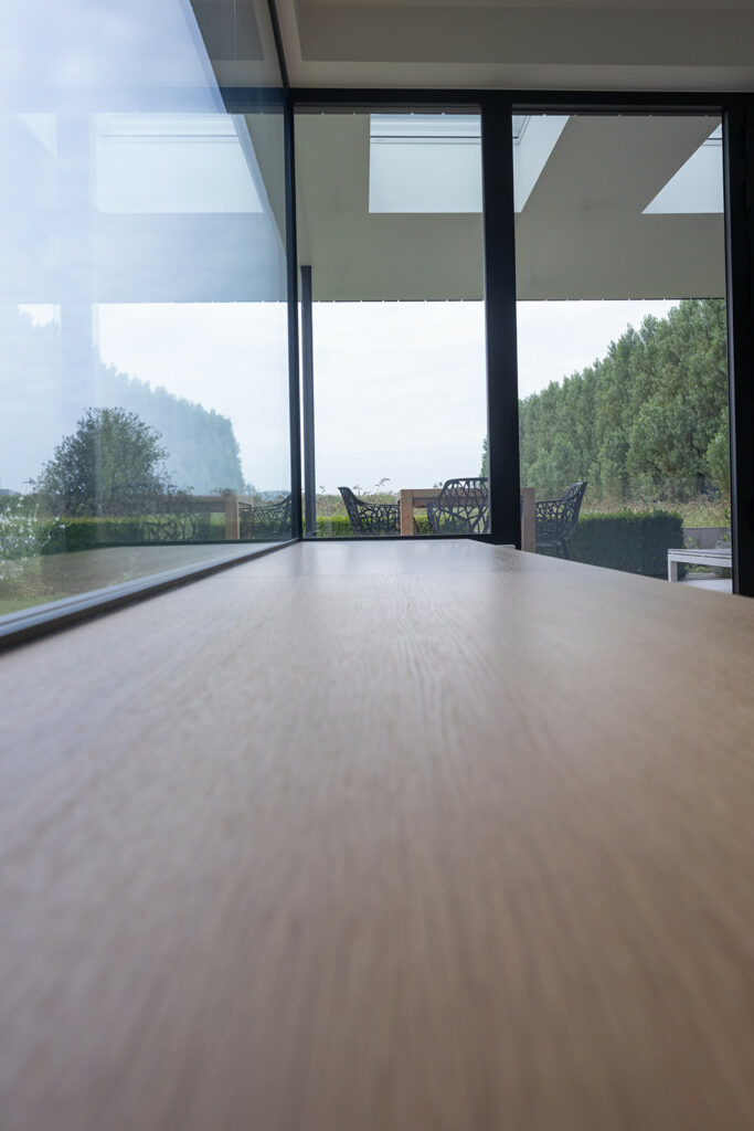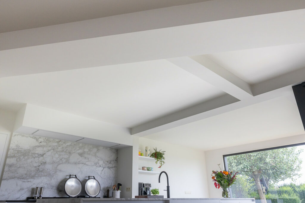 De nieuwe aanbouw voorziet hier helemaal in, waarbij de bestaande schuine indeling via plafond en vloer de overgang naar het nieuwe volume aankondigt.